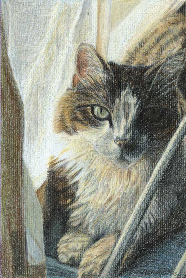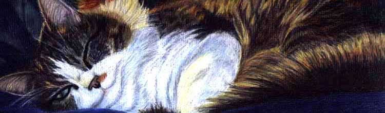 I don't know when or how it donned on me that pet portraits were my favorite things to draw, but I've been enjoying drawing cats, dogs and even birds for years now. My beloved Basil, my large Maine Coon, pictured left, inspired me to draw many portraits of him, giving me a lot of practice with creating feline likenesses. Sadlly, in May of 2009, I had to let Basil go. He had been faithful to me for many years and his job on Earth was done. Luckily for me, I was able to havea drawn so many portraits and he'll live on forever in our memories. |